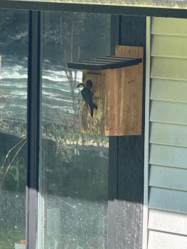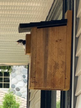 This year, our swallow house has been occupied by a busy family raising 2, maybe 3, babies.  The babies just began chirping last week, and soon after were brave enough to stick their heads out of the little house and watch us timidly.  They were so darn cute!