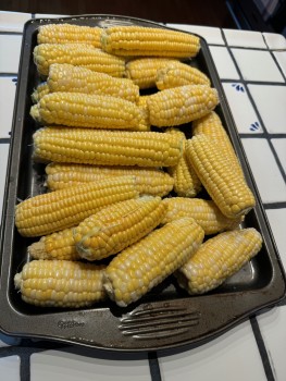 Although we grew a rather bountiful crop of corn in the front yard this year, the results were mildly less than stellar.  We did get a couple of good feeds but many of the cobs were not the nicest flavour or texture.  We did manage to use up all the decent cobs in a big batch of succotash, thereby learning that everything is better with bacon fat.