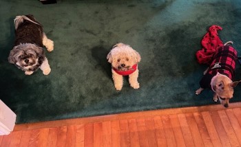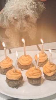 Michelle made beef and cheddar pup cakes, topped with sweet potato whipped "frosting", and boy were they a hit!.  Sam's doggy BFF, Penny, came for a visit to help him enjoy his day and made sure he didn't forget to eat any of his cake.  His mom's and auntie sang him "Happy Birthday" with the help of a full a three dog accompaniment. It was hilarious!