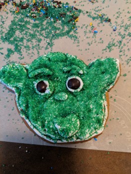 SO.......I am not quitting my day job anytime soon. I was invited to a gingerbread making party and decided to turn my cookie into Yoda. I was happy how it kind of looks like Yoda but I don't think anyone will ever hire me to make a dozen of them.