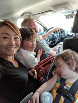 This was taken waiting for the ferry. Sarah passed out covered in chocolate. Little Rob with a mischievous smile. Dandan in the back seat taking care of everyone. Myself, a professional chauffeur.