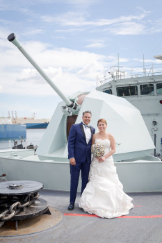 I was so lucky a huge Navy ship came into port and allowed myself and the wedding party to take pictures on the ship. Does anyone notice the huge gun?